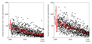 この研究では,まず北陸・東北地方の3観測露場において観測された積雪・融雪期の積雪水量の変動が簡易熱収支法(水津)及び気温指数法(Hock他)で概ね再現できることを確かめています.次いで,気候モデルによる将来の気温上昇及び降水量変化の予測結果に基づいて,現在から2100年までの積雪水量の変化を推定しています.簡易熱収支法及び気温指数法は,多雪地域のダム流域における融雪流出解析にも適用しており,気候変動が積雪・融雪期の流況に及ぼす影響の評価について検討しています.一方,西日本のダム流域を対象として,将来の気温上昇及び降水量変化がダム流入量の流況曲線に及ぼす影響についても調べており,西日本では,気温上昇に伴う蒸発散量の増加よりも降水量変化が流況に及ぼす影響の方が大きいという結果を得ています.
