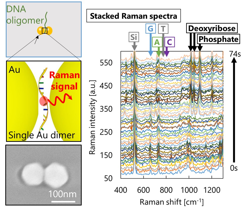 超高感度な1分子表面増強ラマン分光(SERS)計測技術を開発しました。 金ナノ粒子を2つ連結させた「金ナノ粒子二量体」を,連結方向をそろえて等間隔に配列することで,巨大なラマン増強度を有するSERS基板を実現しました。 分子を1分子感度で短時間で検出・識別することが可能です。これまでに,農薬成分分子やDNA塩基分子を高感度に検出・識別できることを示してきました。 さらに,単一のDNA断片の中の単一のDNA塩基を検出・同定が可能であることを示しました。 *SERS:Surface Enhanced Raman Spectroscopy 【応用例】農作物や水の中の農薬成分検出,爆薬成分等危険物質の検出,DNAや代謝産物などの生体分子識別,DNAシーケンシング ■資料(pdfファイル) |