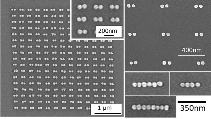 金ナノ粒子が発現するプラズモン共鳴の特性は近接する他の粒子との相互作用に大きな影響を受けます。 プラズモン共鳴特性を制御するために所望のナノ粒子配列を実現する技術が必要になると考えました。 そこで,ナノスケールの溝をテンプレートとしたセルフアセンブル粒子配列技術を構築しました。 左の写真は1分子表面増強ラマン分光(SERS)用に作製した直径60nmのナノ粒子二量体配列です。 本技術を使うことで,右の写真のようにナノ粒子間隔を制御可能です。また,ナノ粒子連結個数も変えることができ, それにより吸収スペクトルにおけるピーク波長を制御可能であることを示しました。 |
