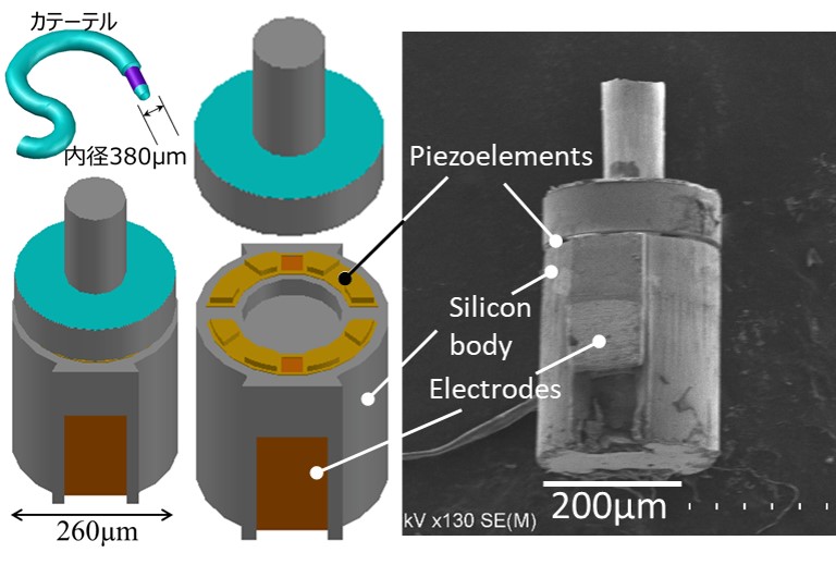 現在、カテーテルや内視鏡を用いた低侵襲性医療が広く普及していますが、これら医療機器を体の各管内に挿入する際に、機器先端が管内側壁と衝突し、 管側壁を損傷する場合があります。そこで、超小型で3軸方向の力覚検知が可能な、外径260 μm の極小MEMS触覚センサを開発しています。 ピエゾ素子と円筒部分が集積された”検知部”と,外径260 μm の円筒型Si基板の内部に貫通電極を有する”電極部”を接合した構造を作製しています。 |