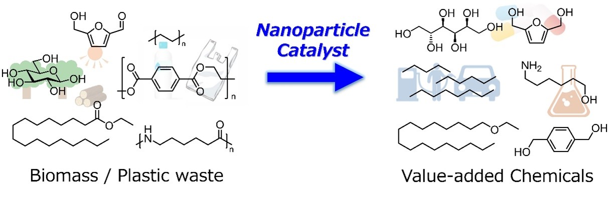 独自の触媒設計・合成技術に基づき、膜応用が可能な新規ナノ材料の合成に取り組んでいます。具体的には、再生可能なバイオマス資源や廃プラスチックを効率的に高付加価値化合物へと変換する、高機能金属ナノ粒子触媒の開発を行っています。