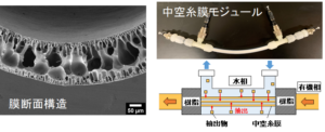 (左)中空糸膜断面構造(右上)中空糸膜モジュール(右下)中空糸膜モジュール概略図