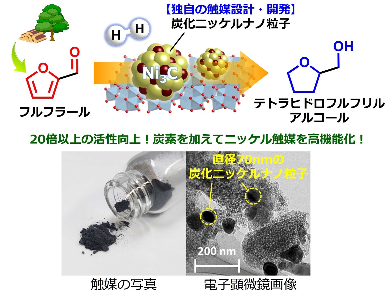 最近、ニッケルと炭素原子からなる炭化ニッケルナノ粒子を開発し、バイオマス由来フラン化合物の液相水素化反応において、既存のニッケル触媒を凌駕する高い触媒活性が発現することを明らかにしました。独自の触媒設計・合成技術に基づく、高機能な金属ナノ粒子触媒の開発を目指します。