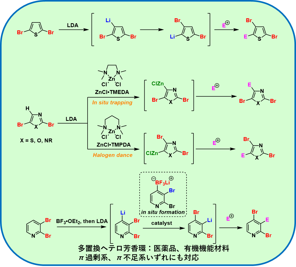 最近では,五員環ヘテロ芳香族化合物誘導体であるチオフェンやチアゾール、さらにオキサゾールやイミダゾールと芳香族ハロゲン化物とのクロスカップリング反応において,分子内で炭素アニオンとハロゲン置換基が入れ替わるハロゲンダンスを利用すると,複数の芳香族置換基をヘテロ芳香環内に一挙に導入し,多置換ヘテロ環誘導体を極めて効率的に合成することに成功しています。また、従来では困難であった六員環ヘテロ芳香族化合物であるピリジンについても同様にハロゲンダンスの進行および置換基の導入が効率的に進行することを見出しています。