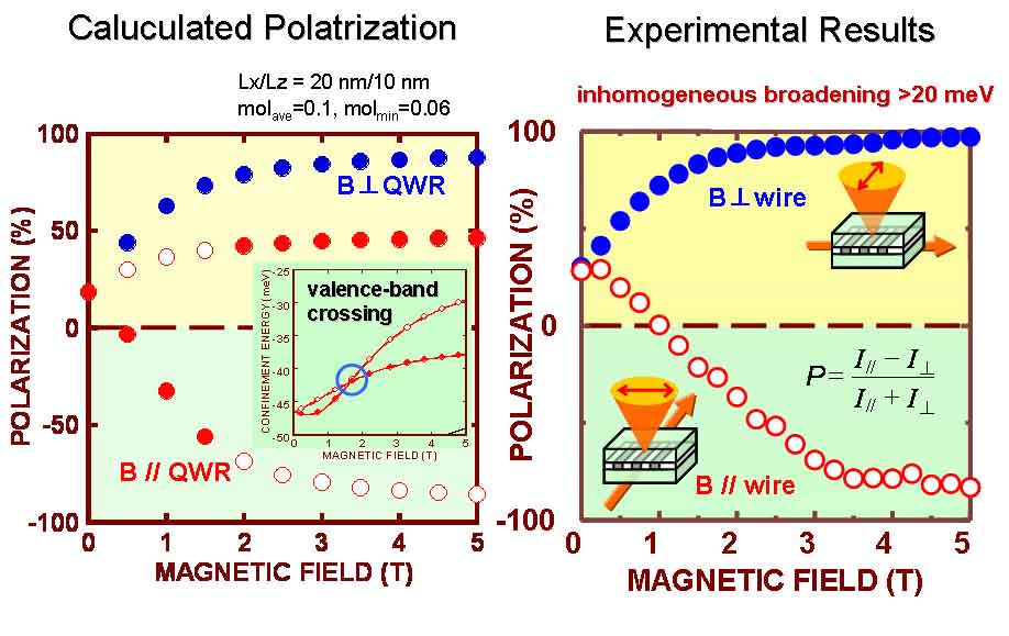 | 希薄に磁性不純物を含む半導体中に励起子が形成されると、励起子のスピンが近傍の磁性不純物のスピンの方位を揃え、局所的に磁気光学効果が増強されます。その結果、励起子近傍で局所的なポテンシャルの安定状態が作られ、発光特性や伝導特性に大きな影響を与えます。これは励起子磁気ポーラロンとして知られています。われわれはこの励起子磁気ポーラロンがそれと同程度の大きさの量子細線構造に閉じ込めたとき、異方的な磁気応答特性を示すことを発見しました。 |