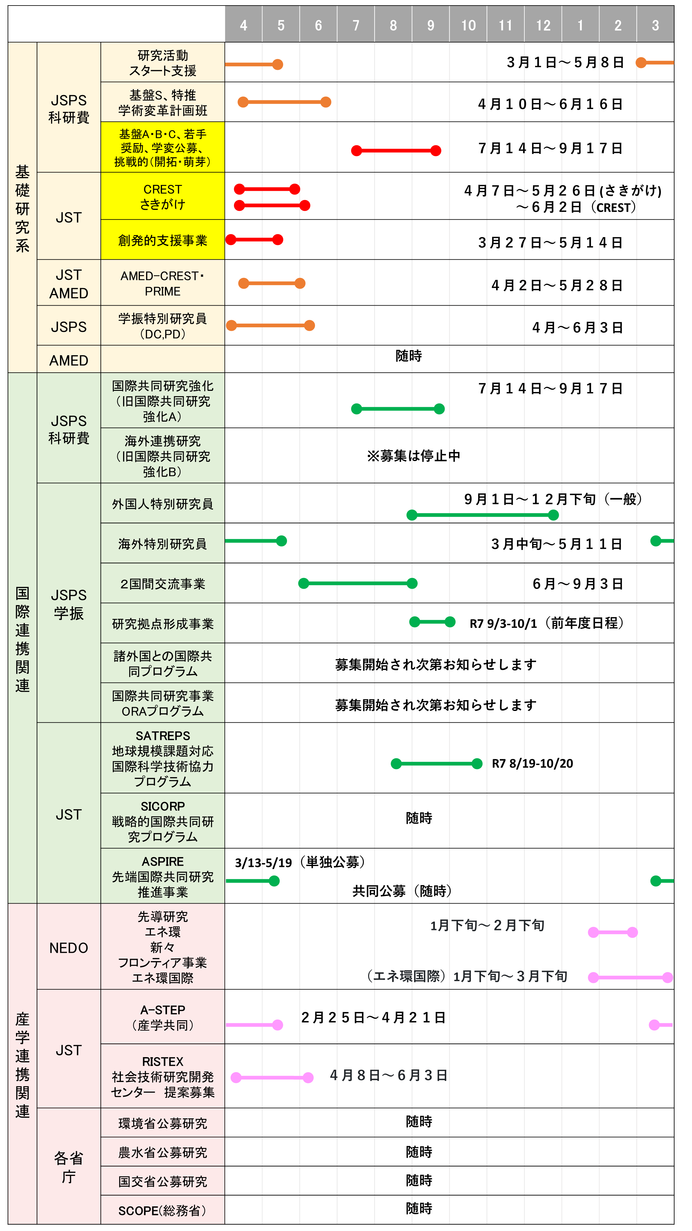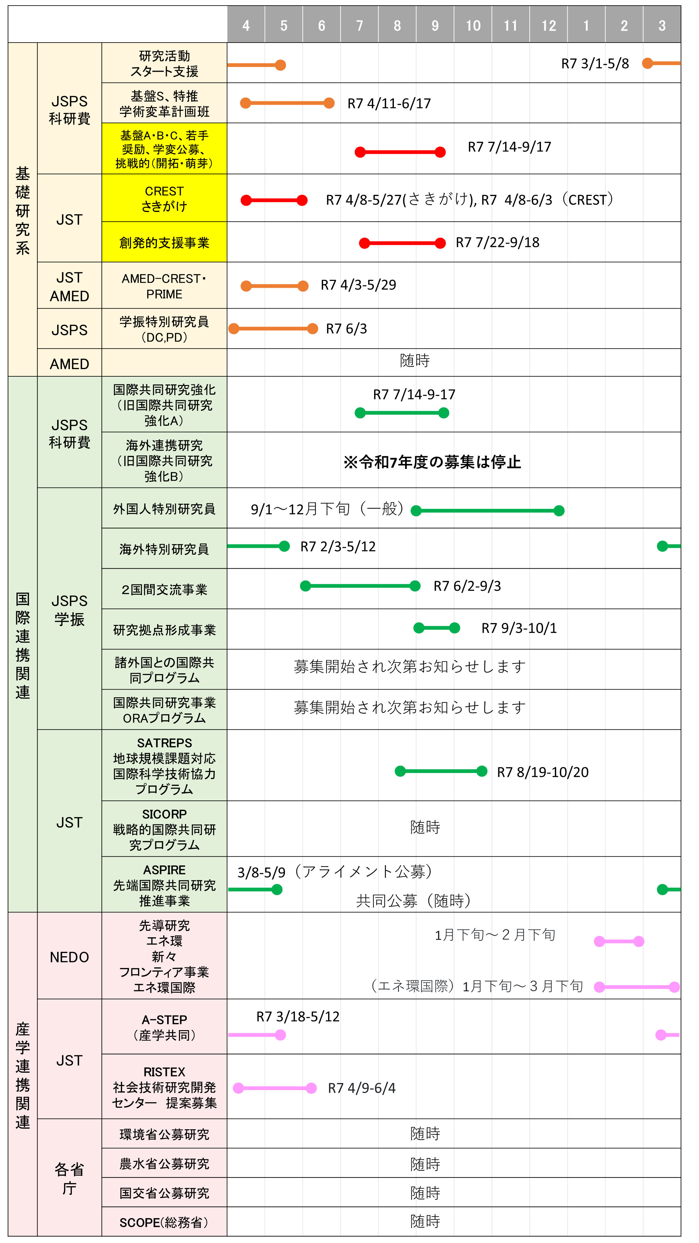 各公募の公募情報や正確なスケジュールはURAにお尋ねいただくか、各公募のHP等をご確認ください