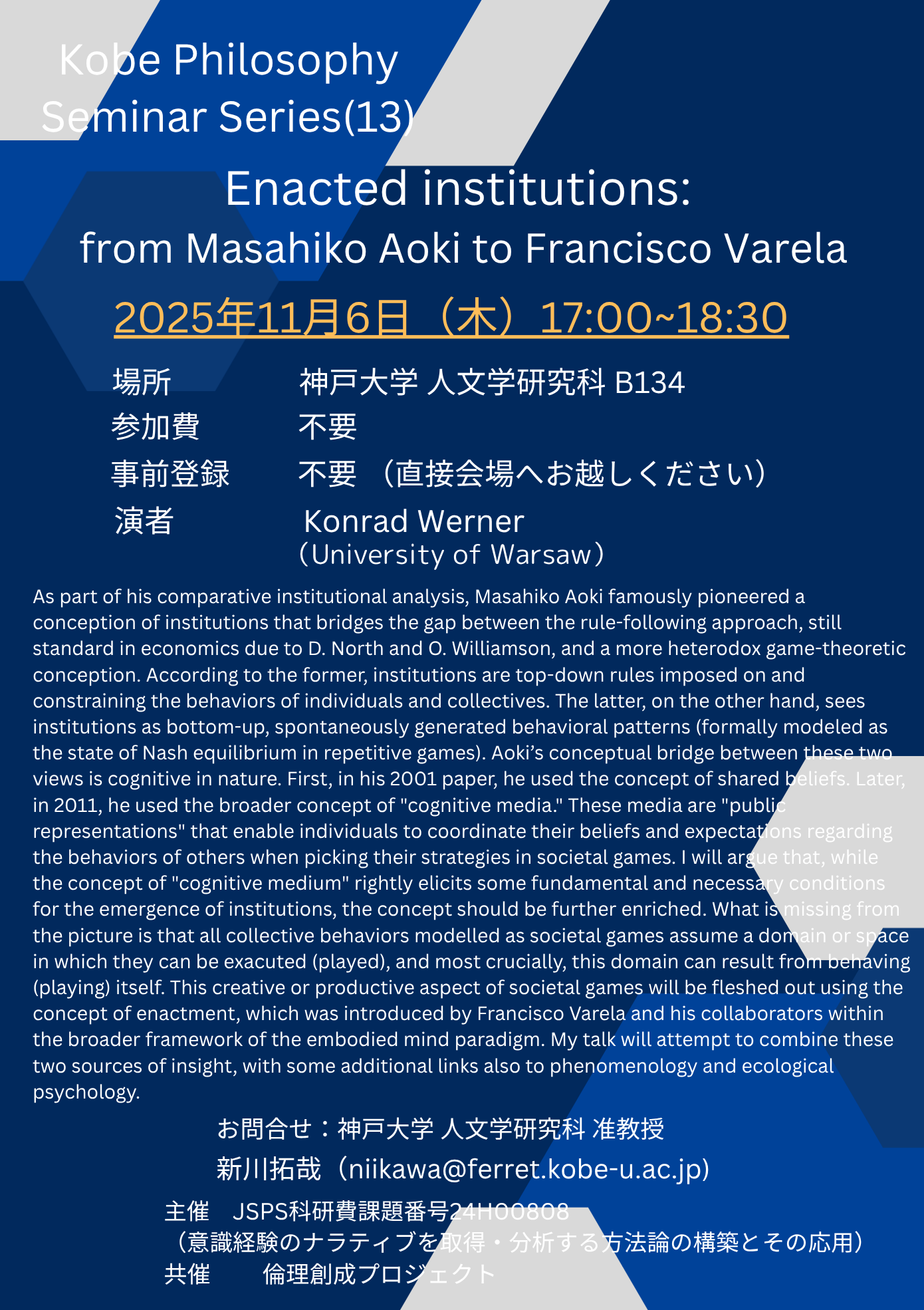 Kobe Philosophy Seminar Series (13):「Enacted institutions: from Masahiko Aoki to Francisco Varela」