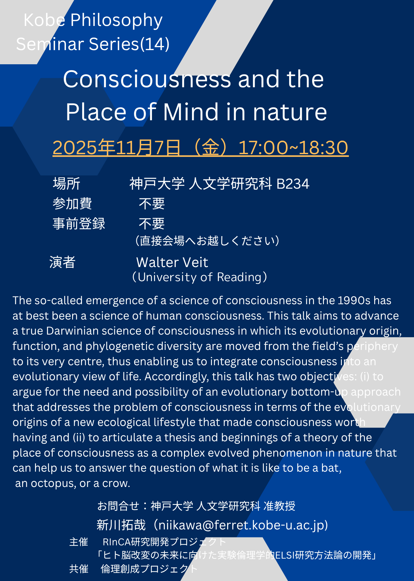 Kobe Philosophy Seminar Series (14):「Consciousness and the Place of Mind in Nature」