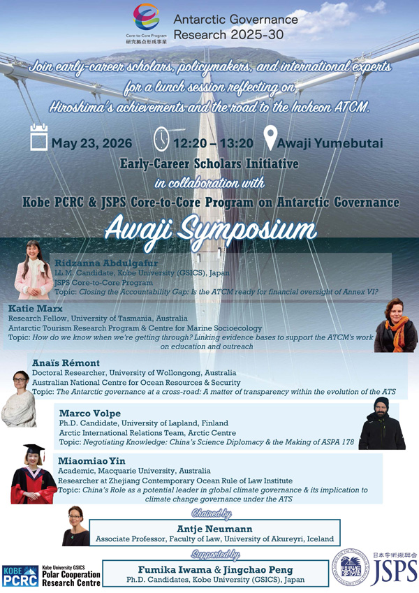 Kobe PCRC is proud to hold its 6th annual Antarctic public symposium; this time, right after the 48th Antarctic Treaty Consultative Meeting (ATCM) held in Hiroshima City. In a more relaxed atmosphere surrounded by spring floors and with a great ocean view of Seto-Naikai from a world-famous Awaji Yumebutai International Conference Center, designed by ANDO Tadao, this out-of-diplomacy setting will promote frank exchange of opinions amongst the ATCM/CEP delegates, academia, and civil societies both from Japan and abroad on the achievements of Hiroshima ATCM/CEP and the remaining challenges towards the 2027 ATCM in the Republic of Korea and beyond. The symposium will have 6 sessions, focusing on (1) Reports from the Hiroshima ATCM/CEP; (2) Antarctic legal and policy issues; (3) Antarctic science-policy interface; (4) Lunch time early-career scholars session; (5) Antarctic tourism; and (6) Antarctic environmental protection.