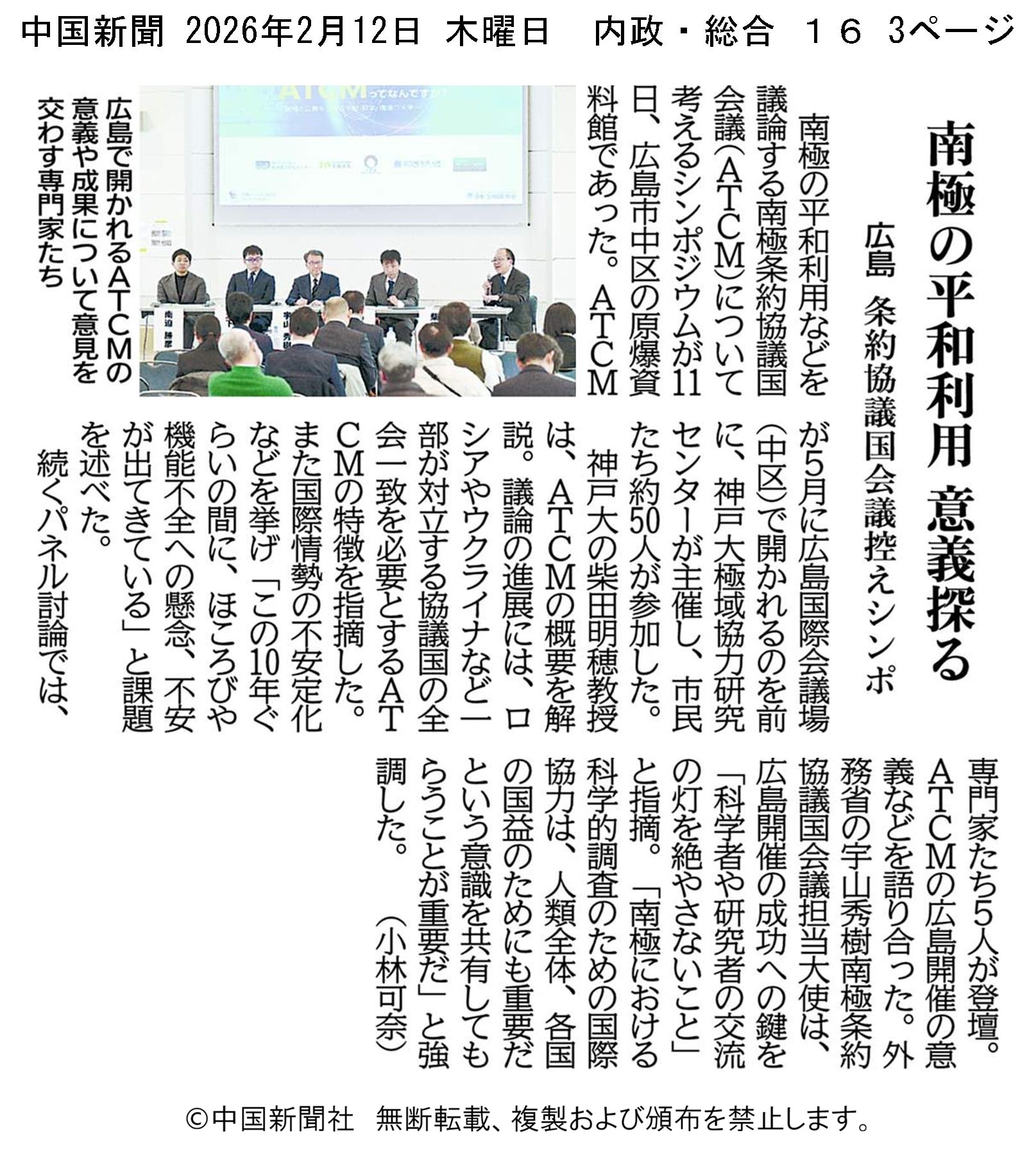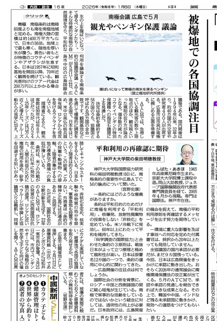 2026年1月8日発刊の中国新聞朝刊において、広島ATCMに関する柴田センター長によるインタビュー記事「平和利用の再確認に期待」が掲載されました。画像をクリックすると掲載記事それ自体が閲覧できます。またウェッブ版での全文はこちらのサイトから閲覧できます。